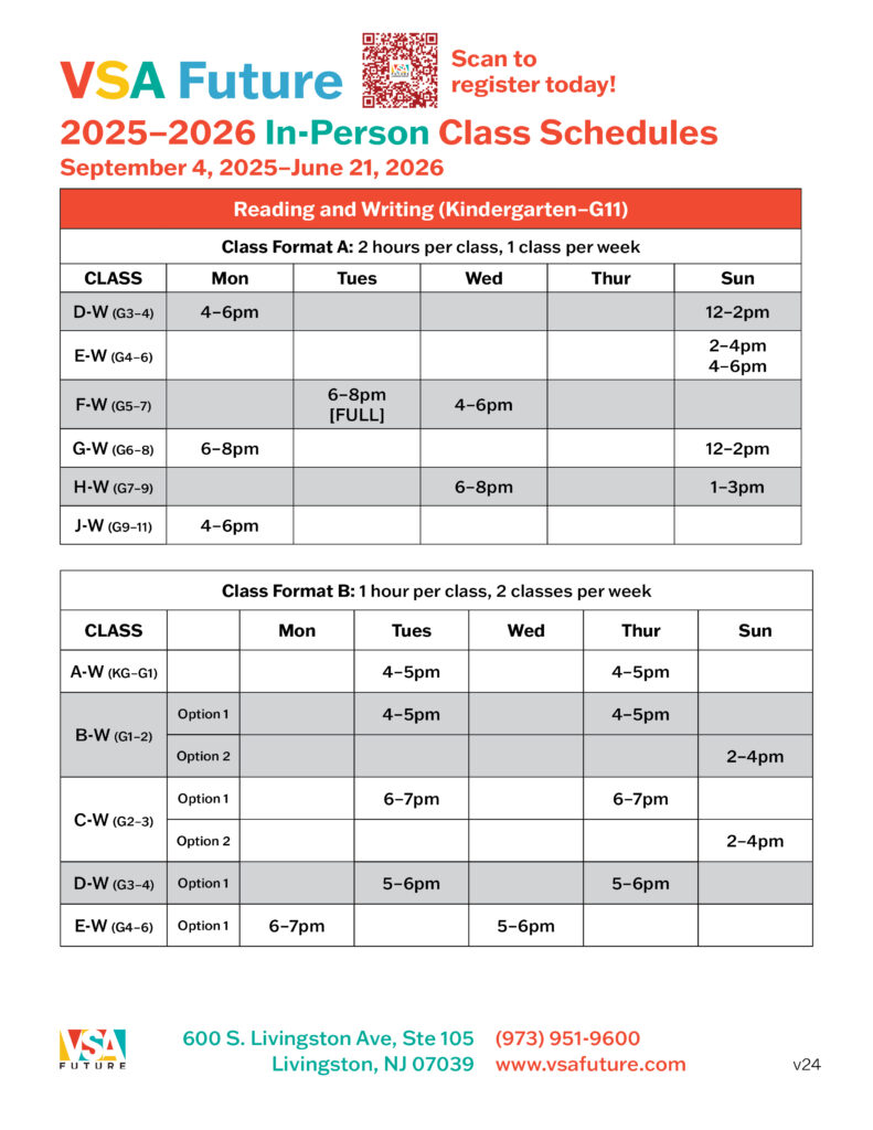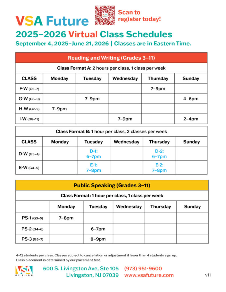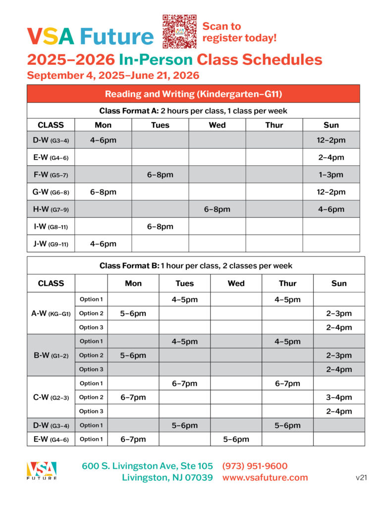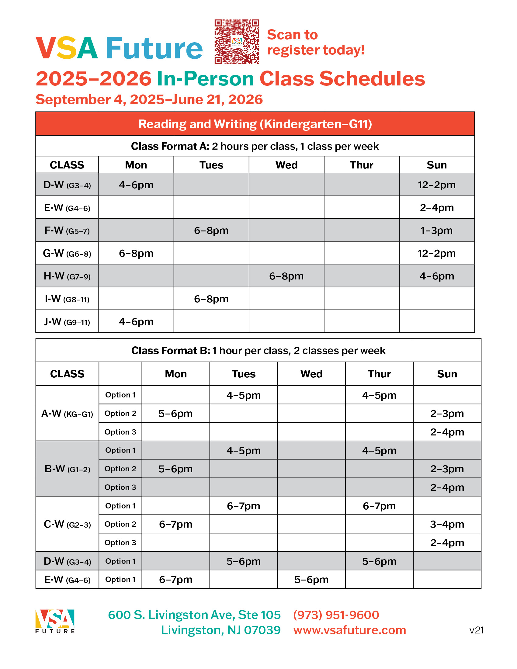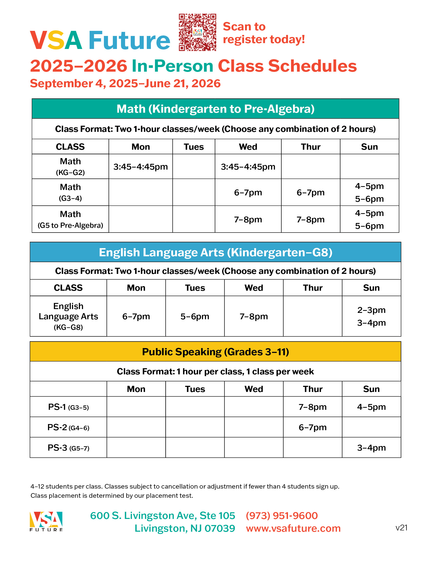 Schedule 2025–26 VSA Classes September 4, 2025–June 21, 2026 VSA Virtual Class Schedule VSA In-Person (Livingston, NJ) Class Schedule Want to Enroll Your Child? Experience premium-quality education from the comfort of home or at our Livingston learning center. Sign up with VSA Future Learning Center today! Enroll Now