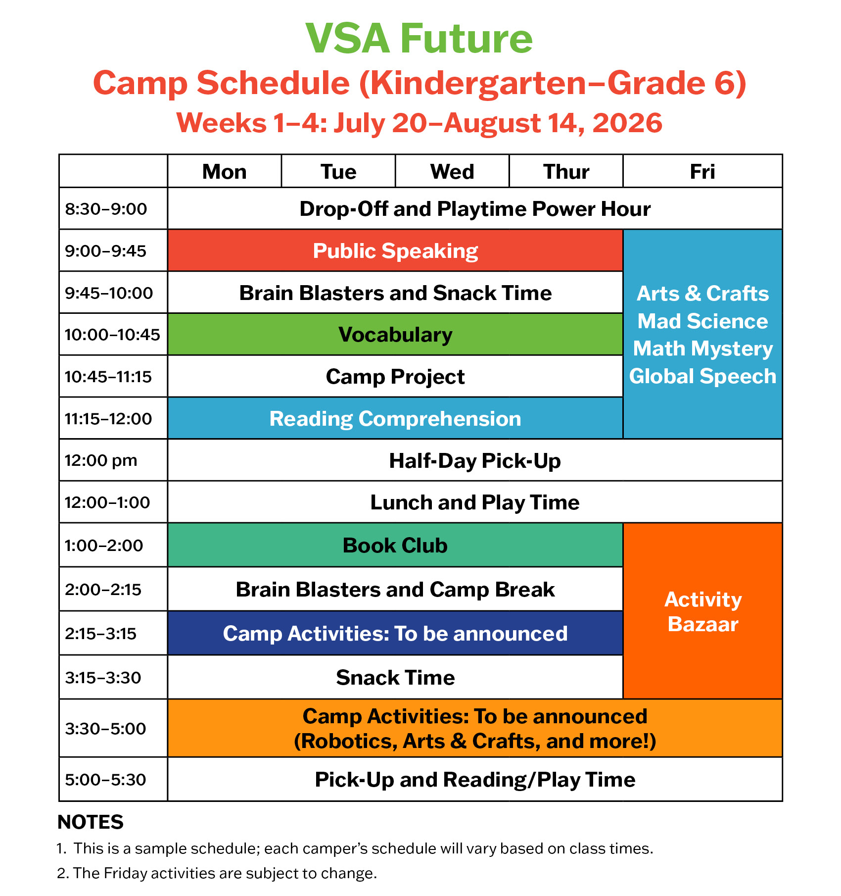 Register online here. When you sign up, you’ll choose the number of weeks and which weeks. Note: Parents can change which camp weeks their child takes before April 30, 2026, by emailing admin@vsafuture.com.